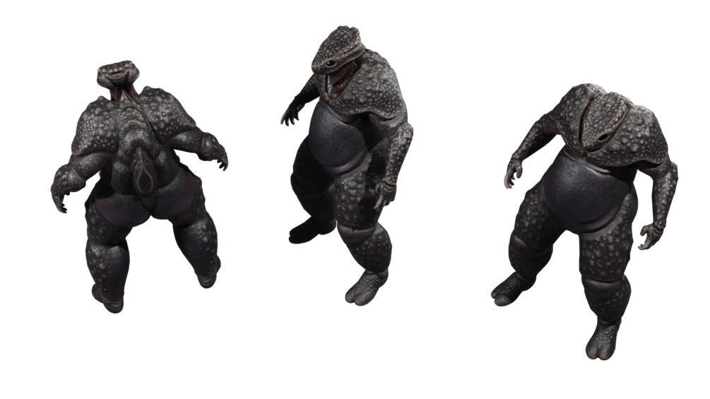 These huge, chunky aliens are called the Boldurr. They breathe through their back holes and eat through their neck - which contracts downwards to allow their upper body to become one big battering ram.